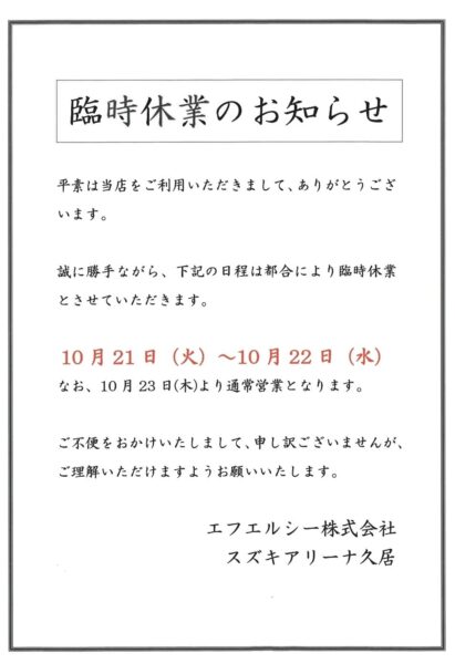 休業中にいただいたお問い合わせにつきましては10月23日以降順次対応させていただきます。